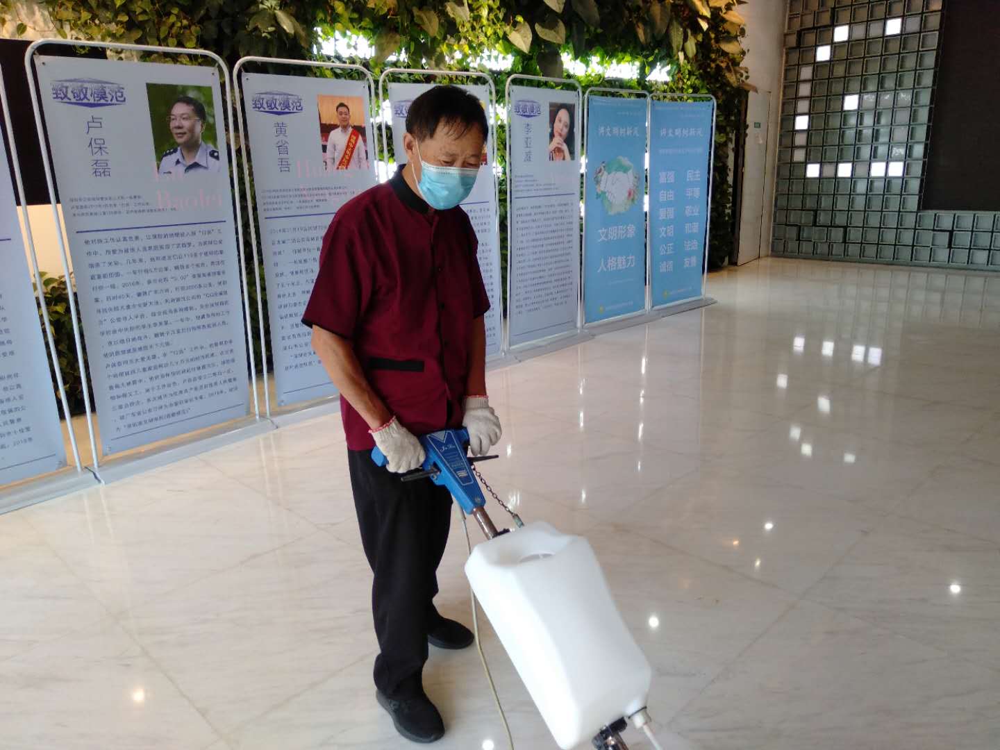 由于當(dāng)時(shí)項(xiàng)目剛剛接手,各項(xiàng)工作尚處在起步階段,人員和物資配備都非常緊缺。面對(duì)問(wèn)題,王雙正沒(méi)有退縮,他沒(méi)有計(jì)較個(gè)人得失,主動(dòng)申請(qǐng)延長(zhǎng)個(gè)人工作時(shí)間,在很大程度上彌補(bǔ)了人力的不足。在休息時(shí)間,他親自動(dòng)手用針線縫制受到損耗的清潔用具,盡可能提升復(fù)用率。在上崗的幾個(gè)月里,他把崗位當(dāng)作戰(zhàn)位,每塊玻璃門窗,每個(gè)衛(wèi)生死角,都留下了他清晰而忙碌的身影。經(jīng)過(guò)長(zhǎng)期不懈的努力,王雙正和他的團(tuán)隊(duì)終于受到服務(wù)單位和各位來(lái)賓的肯定和認(rèn)可。也正是通過(guò)在不斷解決環(huán)境管理中出現(xiàn)的新情況、新問(wèn)題,并給出可行的改進(jìn)措施,王雙正一次次找到了優(yōu)化工作成效、提升綠清服務(wù)質(zhì)量的經(jīng)驗(yàn)和方法,他本人也因此晉升為綠清環(huán)境維護(hù)團(tuán)隊(duì)的領(lǐng)班。