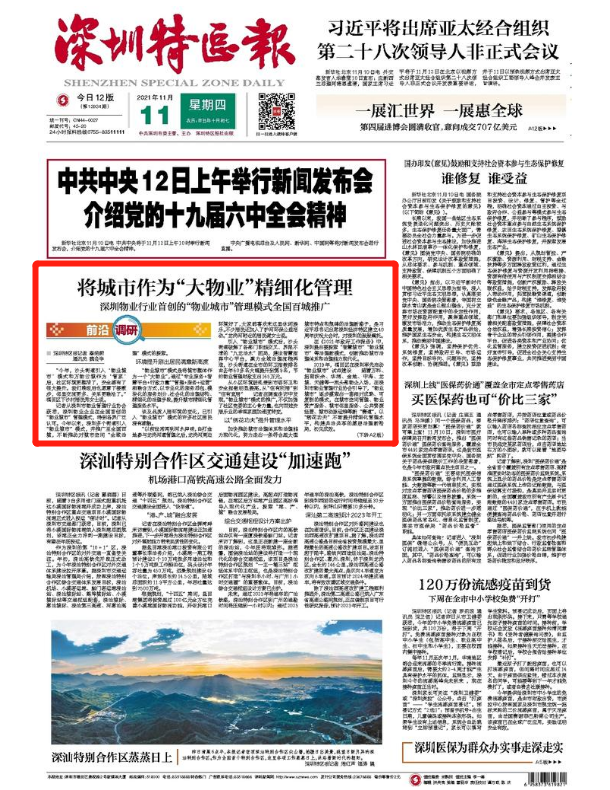11月11日,《深圳特區(qū)報(bào)》頭版刊發(fā)“前沿調(diào)研”文章《將城市作為“大物業(yè)”精細(xì)化管理》,重點(diǎn)關(guān)注深圳物業(yè)行業(yè)首創(chuàng)的“物業(yè)城市”管理模式在全國(guó)百城推廣。