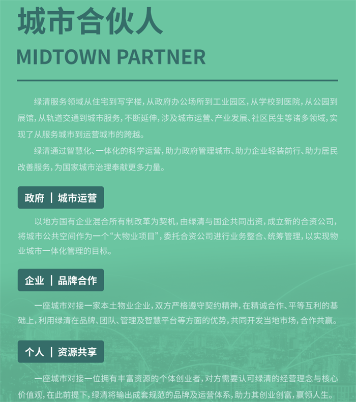 志同道合才為謀,順勢(shì)而為方有為。綠清希望能與那些認(rèn)同綠清企業(yè)文化、看好物業(yè)行業(yè)發(fā)展前景,并且有服務(wù)精神、契約精神的合作伙伴,一起緊跟國(guó)家政策與“物業(yè)城市”發(fā)展趨勢(shì),積極拓展城市服務(wù)業(yè)務(wù),持續(xù)推進(jìn)城市服務(wù)落地,為城市治理貢獻(xiàn)物業(yè)力量。