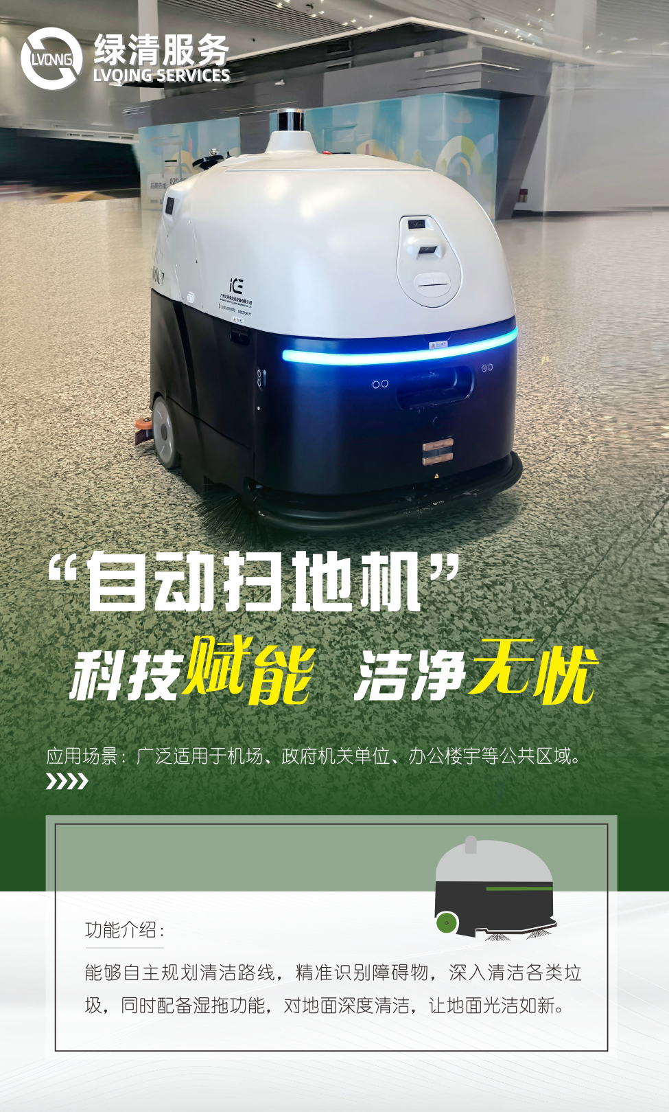自動掃地機(jī)集高效清潔與智能導(dǎo)航于一體,相比傳統(tǒng)人工清掃,自動掃地機(jī)的工作效率提升數(shù)倍,能夠在短時間內(nèi)完成大面積清潔任務(wù),使清潔人員有更多時間投入到其他服務(wù)中,實現(xiàn)人力資源的優(yōu)化配置,提升了綠清服務(wù)的專業(yè)形象。