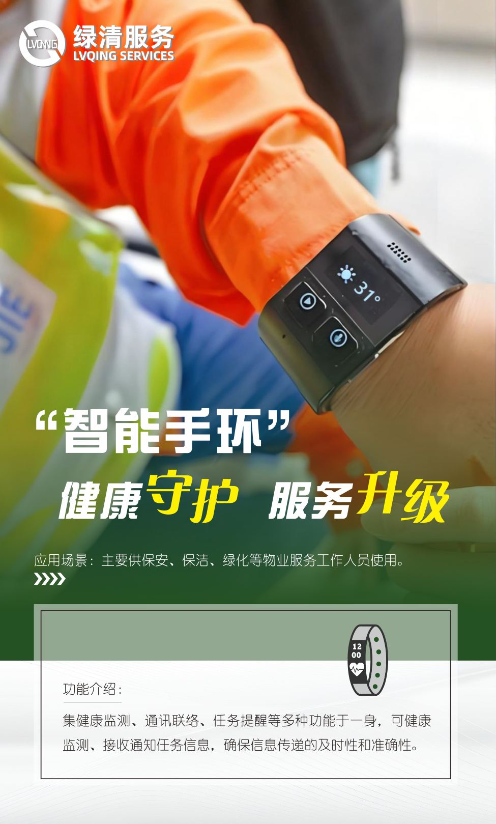 智能手環(huán)是物業(yè)工作人員的“貼心伙伴”,通過智能手環(huán),綠清服務(wù)能夠更好地加強(qiáng)團(tuán)隊內(nèi)部的協(xié)作與溝通,確保服務(wù)人員處于最佳工作狀態(tài),提高了服務(wù)響應(yīng)速度,為業(yè)主提供更加貼心、高效的服務(wù)體驗,提升了整體服務(wù)質(zhì)量。