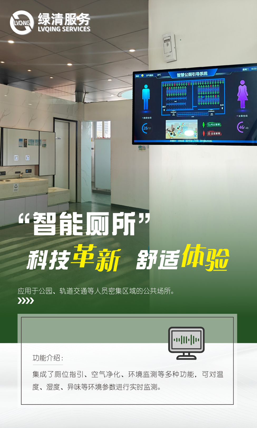 智能廁所的引入,不僅提升了綠清服務(wù)公共設(shè)施的現(xiàn)代化水平,還通過科技手段解決了傳統(tǒng)廁所存在的衛(wèi)生、安全等問題,增強(qiáng)了物業(yè)服務(wù)的吸引力和競爭力。同時,幫助綠清服務(wù)提高了工作效率,進(jìn)一步提升了物業(yè)服務(wù)的整體水平。