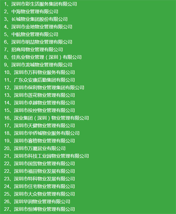 深圳物管行業(yè)2015年度“綜合實力50強(qiáng)”名單: