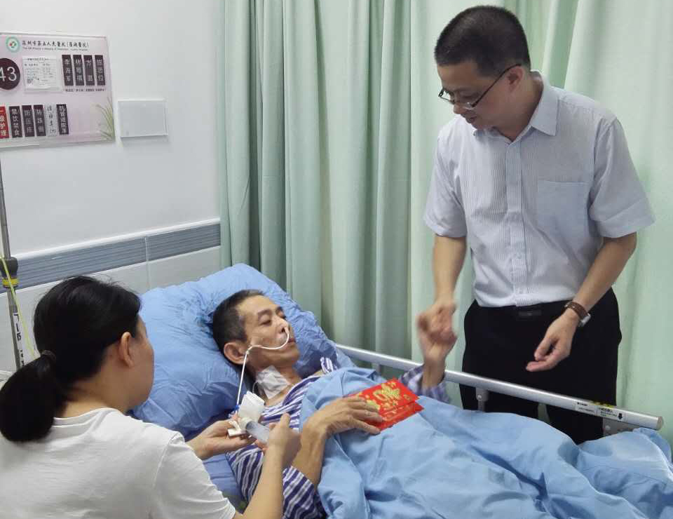 2016年7月18日上午,賴茂蓮經(jīng)理代表綠清工會(huì)到醫(yī)院探望綠清物業(yè)文錦渡海關(guān)項(xiàng)目清潔員彭幫忠同志,給他帶去了公司的關(guān)懷和溫暖。