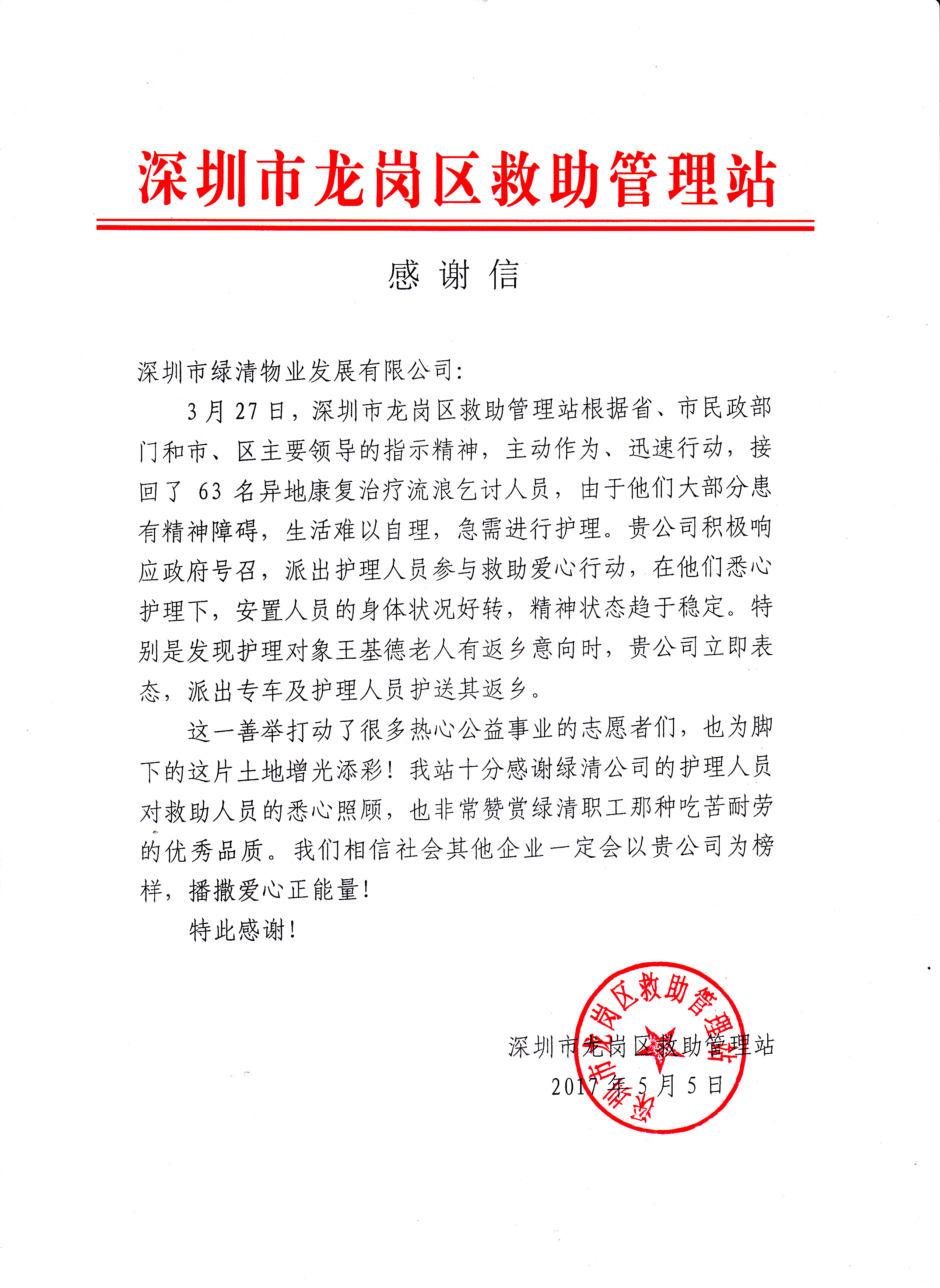 近日,綠清公司收到來自龍崗區(qū)救助管理站關(guān)于我公司積極響應(yīng)政府號(hào)召,悉心照顧并幫助王基德老人順利返鄉(xiāng)一事的感謝信和錦旗,信件內(nèi)容充滿真情,語言樸實(shí)卻不乏感動(dòng)。發(fā)信人最后高度贊賞了綠清職工吃苦耐勞的優(yōu)秀品質(zhì),表達(dá)了...