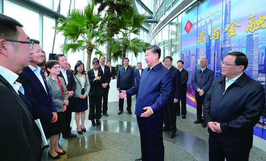 2018年11月6日至7日,中共中央總書記、國家主席、中央軍委主席習(xí)近平在上??疾?。這是6日上午,習(xí)近平在上海中心大廈22層的陸家嘴金融城黨建服務(wù)中心,同正在聯(lián)合開展主題黨日活動的企業(yè)黨員親切交談。 新華社記者 謝環(huán)馳/攝