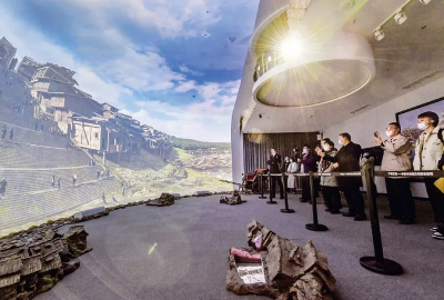 近年來,重慶紅巖革命紀(jì)念館以新技術(shù)把革命文物搬上屏幕和舞臺(tái),創(chuàng)新革命文物展示,讓紅巖革命文物“活”起來。圖為在重慶紅巖革命紀(jì)念館“紅巖記憶”數(shù)字體驗(yàn)廳內(nèi),觀眾們觀看以雙曲三維穹幕技術(shù)展示的場(chǎng)景。新華社記者 李賀/攝