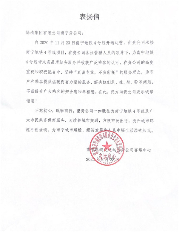日前,南寧軌道交通集團運營分公司客運中心,向綠清南寧分公司授予榮譽錦旗及表揚信,以表彰南寧分公司在南寧地鐵4號線的高品質(zhì)站務(wù)服務(wù)。