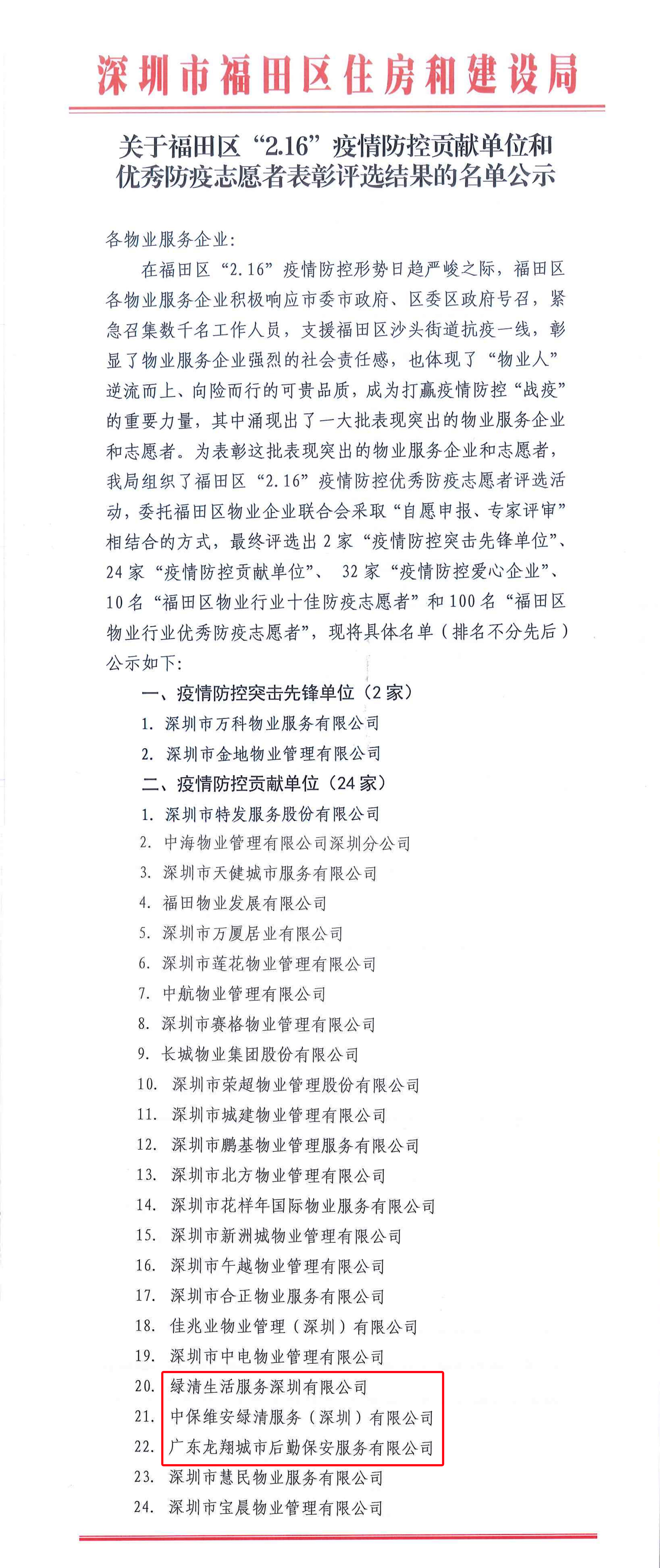 近日,深圳市福田區(qū)住建局下發(fā)了《關于福田區(qū)“2.16”疫情防控貢獻單位和優(yōu)秀防疫志愿者表彰評選結果的名單公示》,對在“2.16”疫情防控期間作出過突出貢獻的物業(yè)服務企業(yè)進行通報表彰。