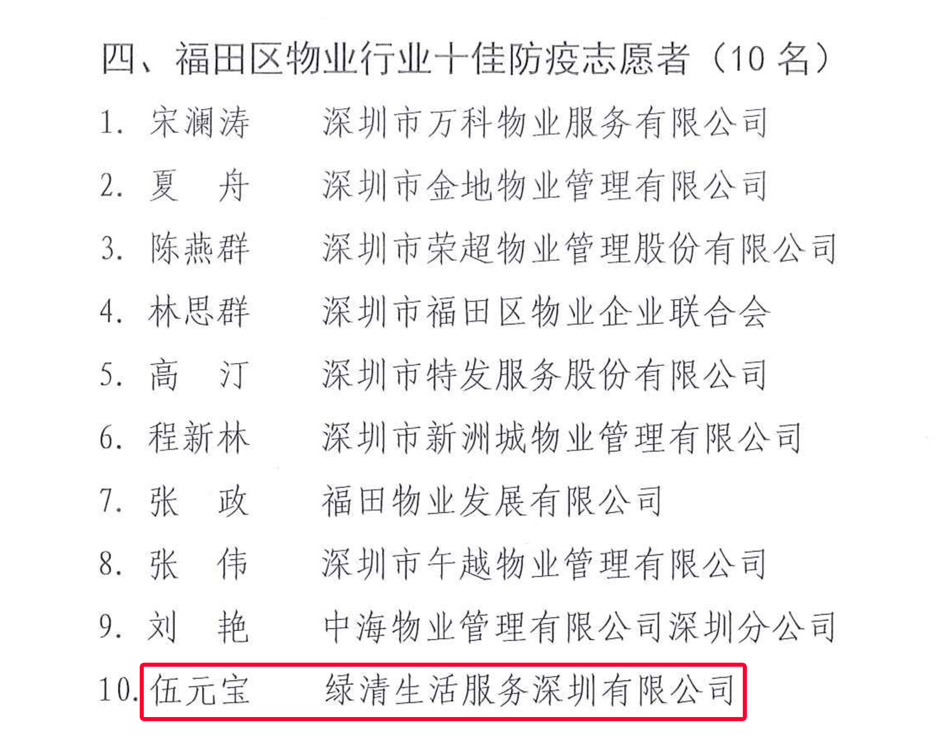 同時,綠清公司員工、“最美志愿者夫妻”伍元寶、張小珊二人分別被評為“福田區(qū)物業(yè)行業(yè)十佳防疫志愿者”“福田區(qū)物業(yè)行業(yè)優(yōu)秀防疫志愿者”。