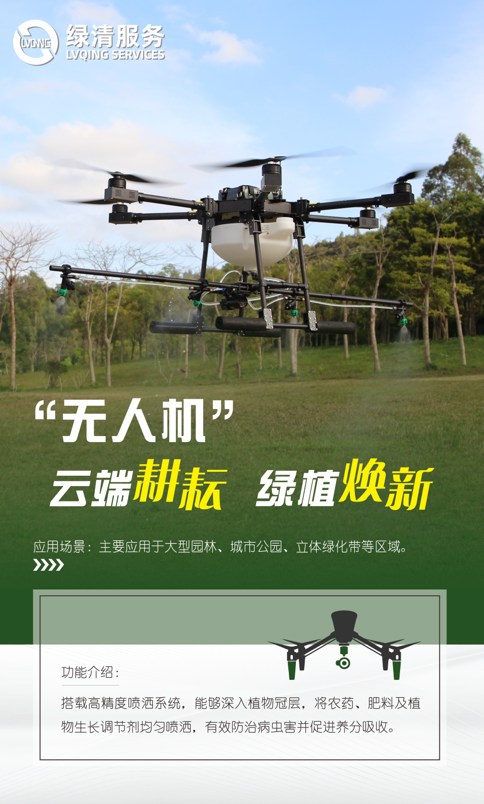 無人機(jī)在綠植養(yǎng)護(hù)領(lǐng)域堪稱“空中多面手”。在時間效率方面,單架無人機(jī)是人工的 20 倍,能夠快速響應(yīng)病蟲害防治等緊急需求。在空間效率上,無人機(jī)可輕松跨越地形障礙,提升場景作業(yè)效率,讓養(yǎng)護(hù)工作更加高效、精準(zhǔn)。