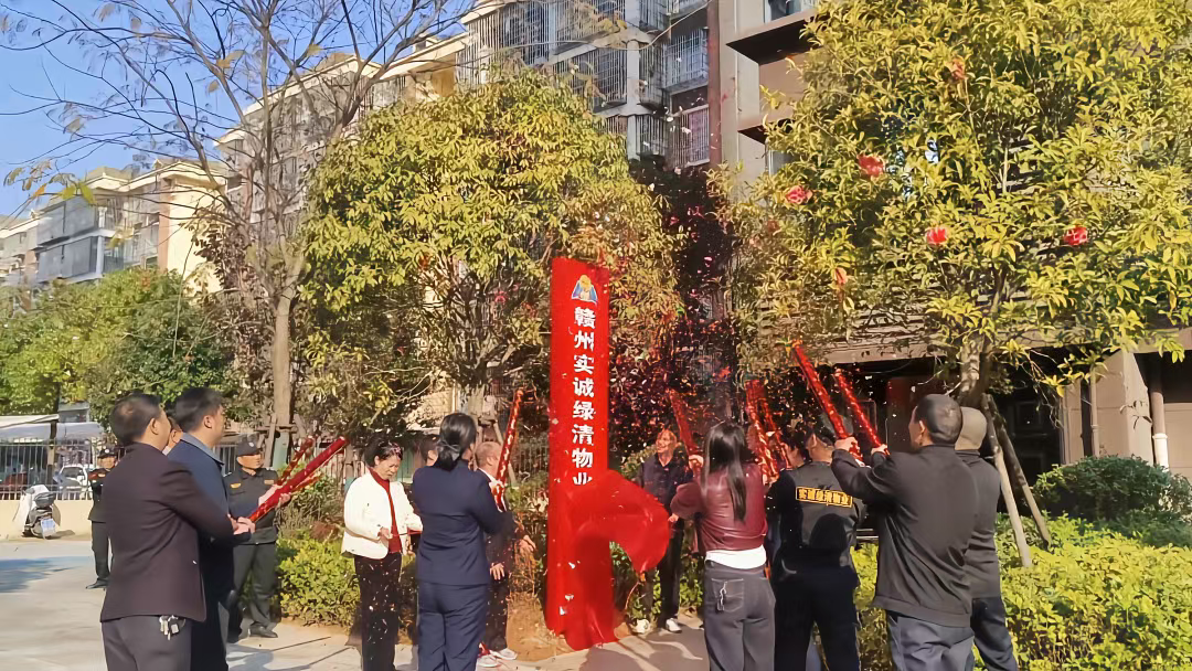 揭牌時刻,禮炮齊鳴,彩花紛飛,在場的物業(yè)團隊、小區(qū)業(yè)主代表共同見證了這一重要瞬間。紅色的揭牌綢布落下,“贛州實誠綠清物業(yè)服務中心”的標識正式亮相,也開啟了為濱江一號南院業(yè)主服務的新篇章。