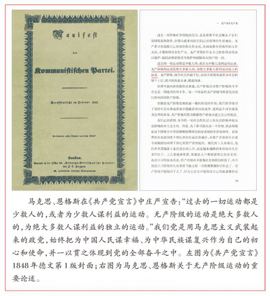 我們黨的初心和使命是建立在馬克思主義科學(xué)理論基礎(chǔ)之上的。馬克思、恩格斯在《共產(chǎn)黨宣言》中莊嚴(yán)宣告:“過去的一切運動都是少數(shù)人的,或者為少數(shù)人謀利益的運動。無產(chǎn)階級的運動是絕大多數(shù)人的,為絕大多數(shù)人謀利益的獨立的運動?!蔽覀凕h是用馬克思主義武裝起來的政黨,始終把為中國人民謀幸福、為中華民族謀復(fù)興作為自己的初心和使命,并一以貫之體現(xiàn)到黨的全部奮斗之中。忘記這個初心和使命,黨就會改變性質(zhì)、改變顏色,就會失去人民、失去未來。只要我們黨牢牢堅持立黨為公、執(zhí)政為民,牢牢堅持為中國人民謀幸福、為中華民族謀復(fù)興,不斷檢視自己,不掩飾缺點,不文過飾非,堅決同一切弱化黨的先進性和純潔性、危害黨的肌體健康的現(xiàn)象作斗爭,就一定能夠始終立于不敗之地。
