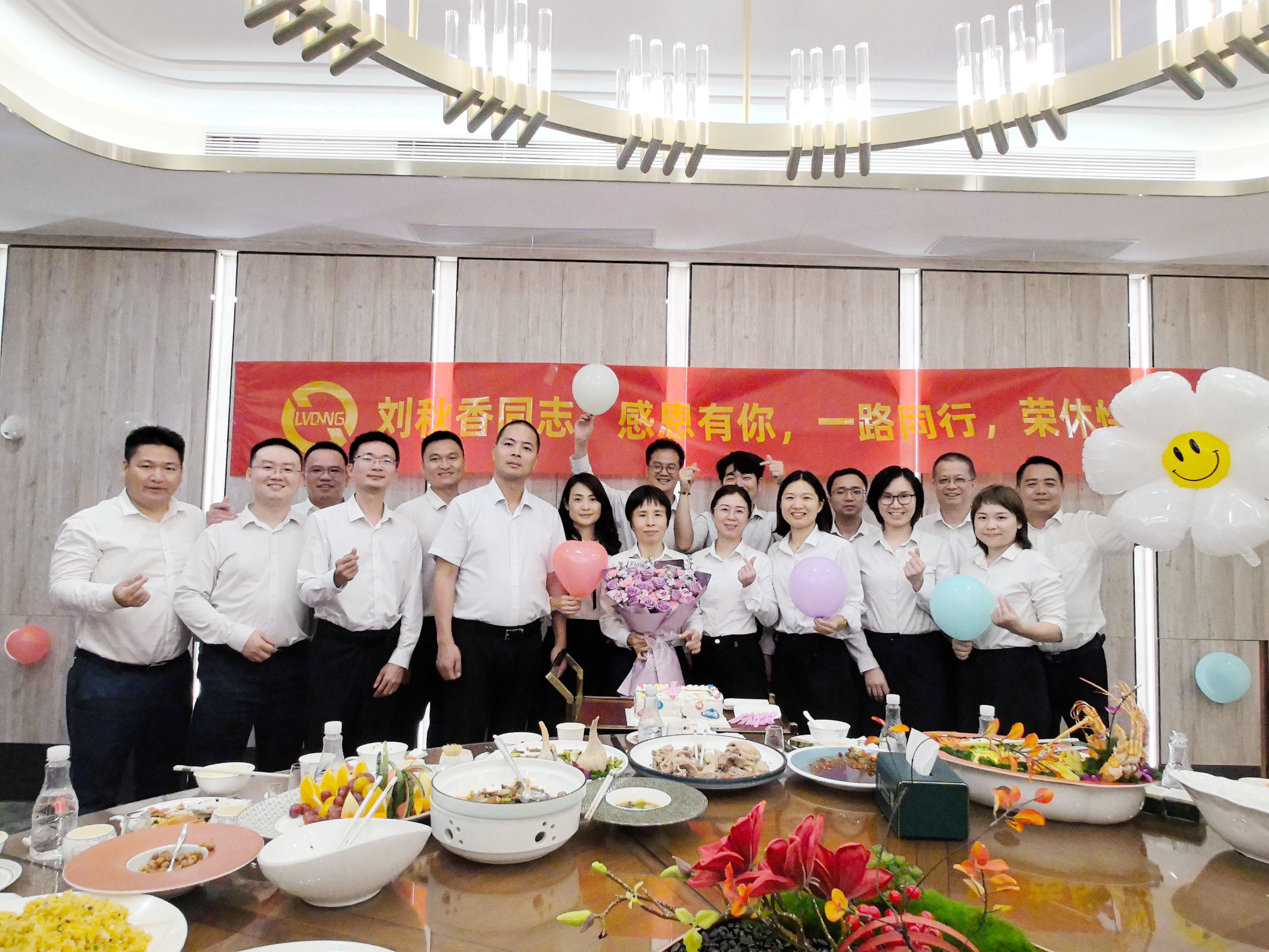 除了座談會,綠清服務(wù)還為劉姐精心準備了一場歡送晚宴。餐桌上,美食佳肴琳瑯滿目,歡聲笑語此起彼伏。公司特地為劉姐定制了一款精美的蛋糕,寓意著綠清服務(wù)與劉姐之間不解的情緣。同事們舉杯共祝,為劉姐送上最誠摯的祝福,希望她在退休后的生活中能夠健康快樂,享受人生的每一刻。