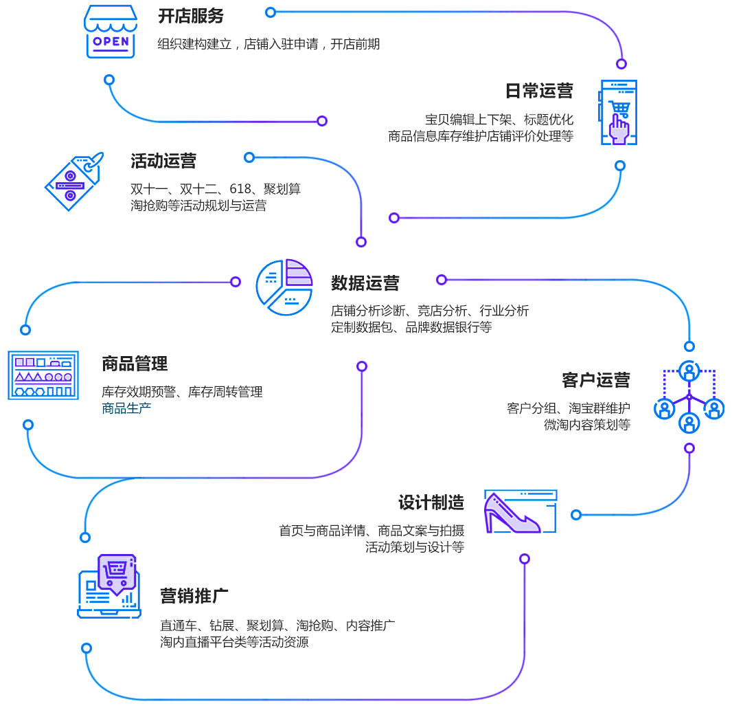 我們?yōu)槠髽I(yè)提供全電商平臺(tái)的一站式代運(yùn)營(yíng)方案,深入企業(yè)開(kāi)展電商的每一個(gè)環(huán)節(jié)